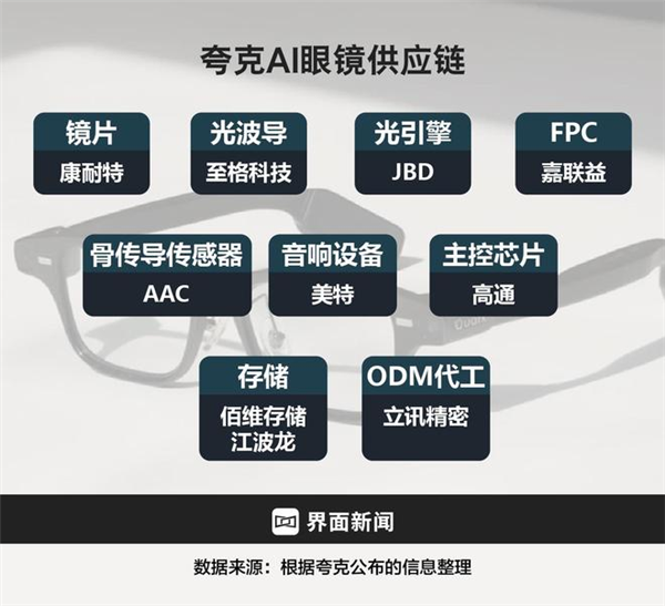 既然说到 AI 眼镜这了,托尼也想顺便提一嘴,其实这个火热的赛道也是供应链企业的百花齐放 —— 就单拿前两天广告投到飞起的夸克眼镜来举例子,除了麦克风是来自瑞声,剩下镜片是康耐特、光波导是至格,最后由立讯精密做 ODM 代工。